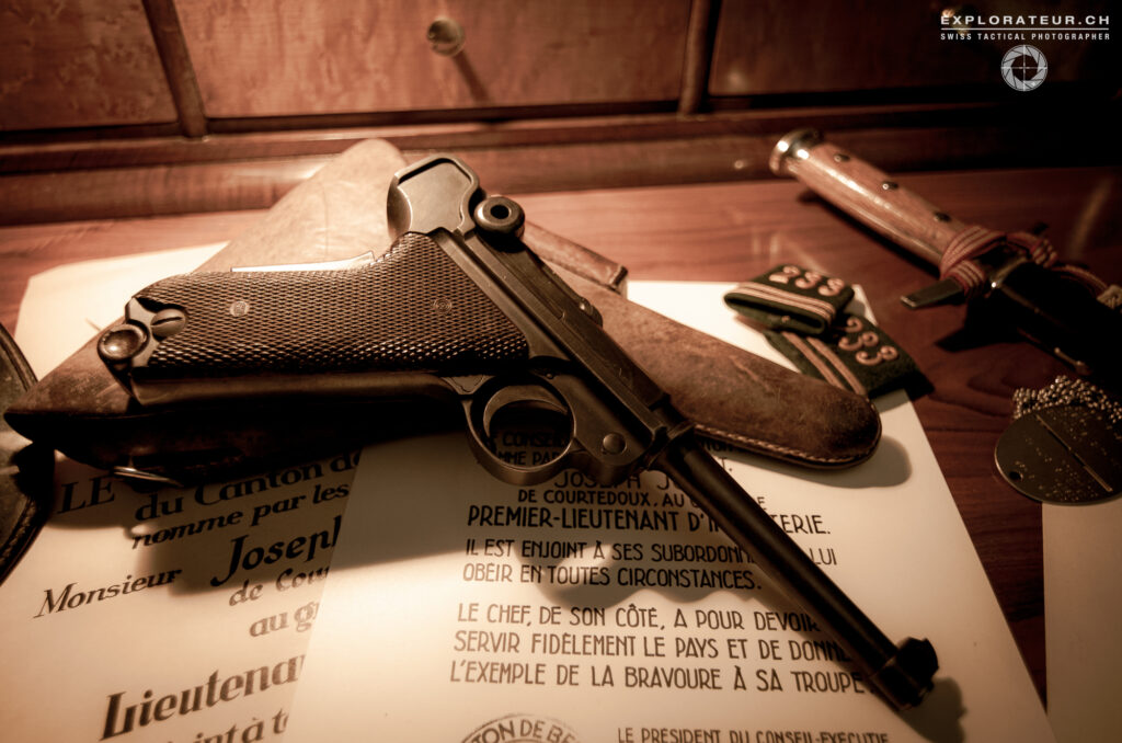 La Suisse adopte donc ce pistolet sous le nom de Parabellum 00, alors qu’il faut attendre 1908 pour que l’Allemagne en fasse de même. La Confédération est alors un pays relativement en avance en ce qui concerne les armes de petit calibre et cela se ressent dans son équipement. En revanche, l’arme n’est pas chambrée en 9mm parabellum, mais en 7.65mm, ce qui la prive d’une certaine puissance. Les 3500 premiers exemplaires sont directement fabriqués par la DWM en Allemagne, par souci de rapidité. 1500 sont assemblée par la Waffenfabrik de Berne (W+F Bern). 10 000 exemplaires supplémentaires sont commandés en 1906 avec quelques menues modifications, donnant naissance au P06. Pendant la Première Guerre mondiale, les usines allemandes fournissent, logiquement, l’armée nationale en priorité. La Suisse rapatrie donc la production des pistolets sur son territoire, comme elle le fera d’ailleurs aussi pour ses mitrailleuses, d’origine germanique également. Mais le temps de mettre les lignes d’assemblage en route, la guerre est terminée. La fabrication continue malgré tout et une nouvelle version voit le jour en 1929, notamment pour diminuer quelque peu les coûts de production.