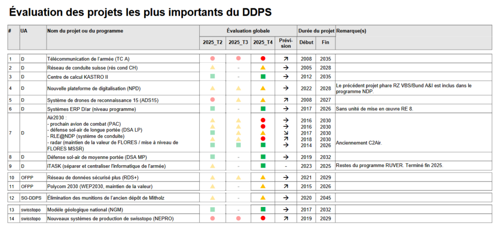 DDPS, Évaluation des projets les plus importants du DDPS, 31.12.2025 : https://www.vbs.admin.ch/dam/fr/sd-web/wHvx1tE0hwtM/Gesamtbeurteilung-Top-Projekte-VBS-31.12.2025-f.pdf
